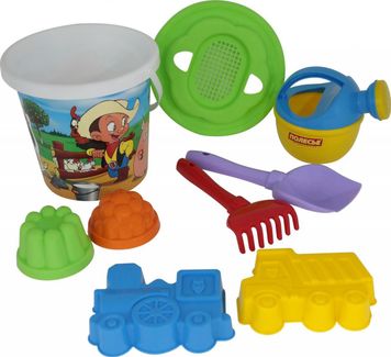 - Набор №170: ведро с наклейкой, ситечко Солнышко, лопатка №5, грабельки №5, формочки (самосвал + паровоз), 2 формочки, лейка малая №4 по выгодной цене 291 р. руб.;