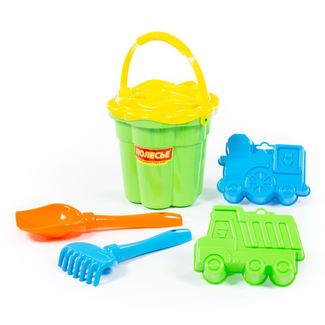 - Набор №319: ведро-цветок среднее №3, ситечко-цветок среднее №3, лопатка №5, грабельки №5, формочки (самосвал + паровоз) по выгодной цене 181 р. руб.;