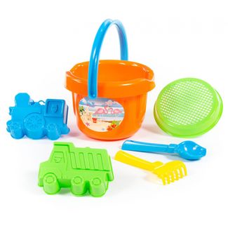 - Набор №34: ведро большое, ситечко, совок №2, грабельки №2, формочки (самосвал + паровоз) по выгодной цене 186 р. руб.;
