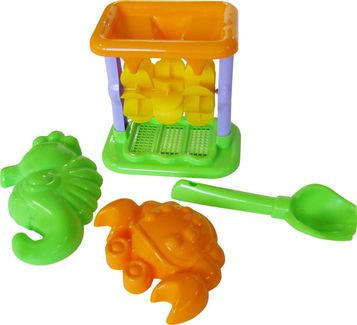 - Набор №344: песочная мельница №2 с основанием, совок №2, формочки (краб №2 + морской конёк) по выгодной цене 164 р. руб.;