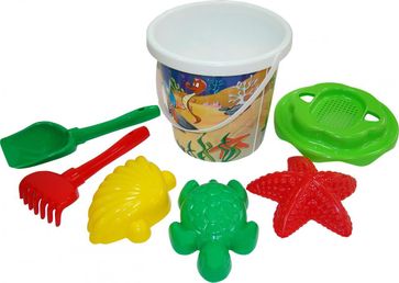 - Набор №357: ведро с наклейкой, ситечко Солнышко, лопатка №5, грабельки №5, формочки (морская звезда №1 + ракушка №1 + черепаха) по выгодной цене 237 р. руб.;