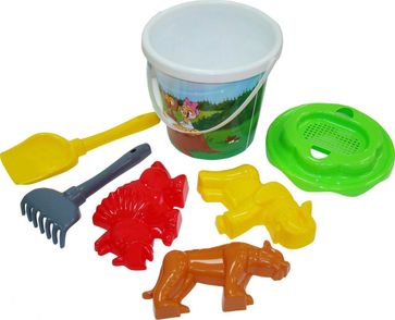 - Набор №358: ведро с наклейкой, ситечко Солнышко, лопатка №5, грабельки №5, формочки (тигр + мамонт + динозавр №1) по выгодной цене 243 р. руб.;
