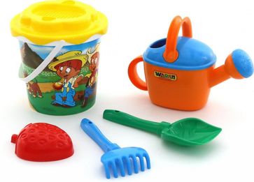 - Набор №389: ведро с наклейкой, ситечко Солнышко, лопатка №5, грабельки №5, формочка Фрукты, лейка №8 по выгодной цене 355 р. руб.;