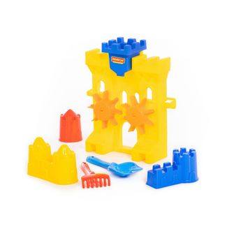 Набор №466: песочная мельница Крепость, лопатка №5, грабельки №5, формочки (замок мост + замок башня + замок стена с двумя башнями)