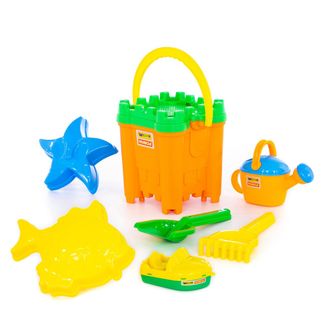 Набор №469: ведро-крепость Макси, сито-крепость Макси, лопатка №30, грабельки №30, формочки (рыба + звезда), катер Ветерок, лейка №8