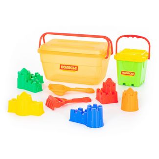 - Набор №500 (в контейнере): ведро-крепость большое, ситечко-крепость большое, совок №8, грабельки №8, формочки (замок мост + замок башня + замок стена с одной башней + замок угловой + замок квадратный) по выгодной цене 759 р. руб.;