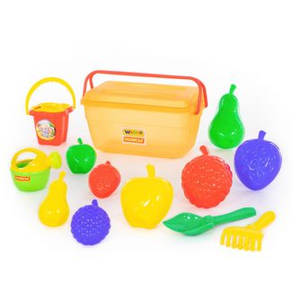 Набор №501 (в контейнере): ведро-цветок среднее, ситечко-цветок, лопата №6, грабли №6, формочки (Фрукты 4 шт + Фрукты большие 4 шт), лейка малая №4