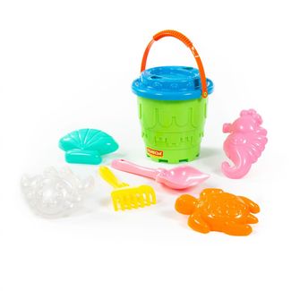 - Набор №532: ведро-замок большое, ситечко-замок, лопатка №5, грабельки №5, формочки (краб №2 + морской конёк + ракушка №2 + черепаха) по выгодной цене 237 р. руб.;