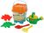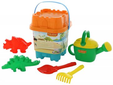 - Набор №588: ведро-замок большое с наклейкой, ситечко-замок большое, лопатка №5, грабельки №5, формочки (динозавр №1 + динозавр №2), лейка №8 по выгодной цене 462 р. руб.;