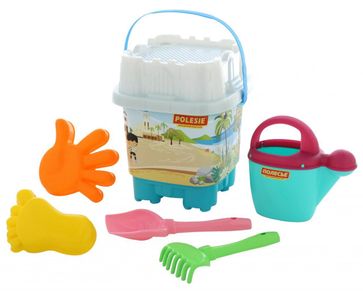 - Набор №590: ведро-замок большое с наклейкой, ситечко-замок большое, лопатка №5, грабельки №5, формочки (ладошка + ножка), лейка №10 по выгодной цене 408 р. руб.;