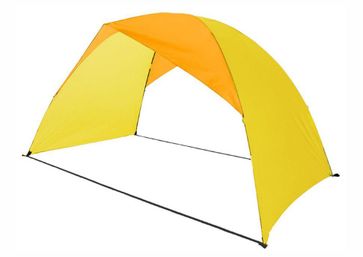 Вес модели составляет всего 1,2 кг. Несмотря на скромные габариты в сложенном виде, палатка в разложенном виде имеет 210 х 120 см. Такие размеры позволяют комфортно разместиться под навесом двум взрослым. Каркас выполнен из двух пересекающихся дуг из легкого, прочного и гибкого стеклопластика диаметром 7,9 мм. Дополнительная перекладина из того же материала поддерживает козырек палатки, что позволяет увеличить площадь затенения. Тент выполнен из прочного полиэстера и имеет пропитку в 1000 мм водного столба, что позволит защититься от небольшого дождя. Модель выполнена в форме арки и хорошо проветривается. Для устойчивости конструкции снизу стенки пляжной палатки соединены между собой прочной стропой. Конструкция не имеет пола и может быть установлена на любой поверхности. В комплекте с тентом прилагается набор колышков и оттяжек для надежной фиксации палатки при сильном ветре. None