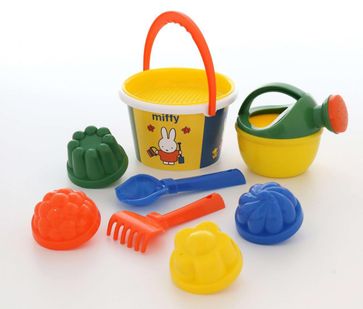 Миффи-6 набор №3: ведро среднее с наклейкой, ситечко, совок №2, грабельки №2, лейка малая №4, формочки 4 шт.