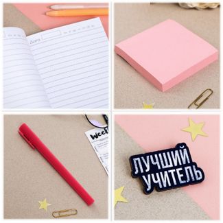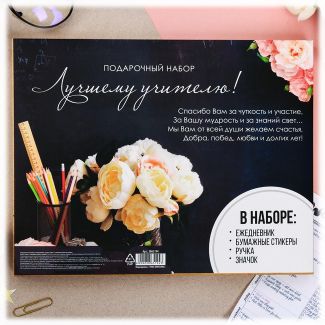 - Лучшему учителю набор подарочный (ежедневник, бумажные стикеры, авторучка, значок) по выгодной цене 400 р. руб.;