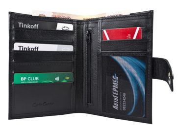 Кожаное портмоне Coste (Косте) выполнено из натуральной кожи черного цвета. Внутри большое отделение для купюр, 9 карманов для карт (один с прозрачным окном), 2 кармана для документов и карман на молнии для мелочи. Закрывается на магнитную кнопку. None Возможен самовывоз. Есть доставка.