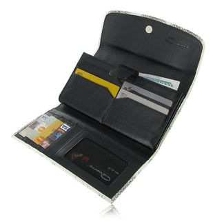10 отделений для кредитных и дисконтных карт, 1 отделение с сетчатым окошком, 2 отделения для чеков и чековой книжки, 1 потайное отделение, 2 отделения для купюр, 1 отделение для монет на молнии, 1 наружный карман, застежка - магнитная кнопка None Возможен самовывоз.