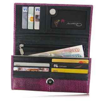 10 отделений для кредитных и дисконтных карт, 3 отделения для купюр, потайной карман на молнии, 2 кармана для мелких документов, 1 сетчатый карман, отделение для монет на металлической защелке, застежка - магнитная кнопка None Возможен самовывоз.