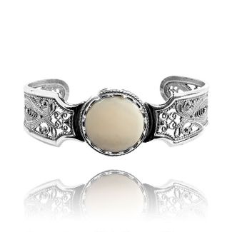 Камень: перламутр. В изделии применяются натуральные камни с цельной структурой и/или с соответствующим химическим составом. Металл: посеребрение, мельхиор. Диаметр браслета: 6 см. Ширина браслета: 2,2 см. None Возможен самовывоз. Есть доставка.