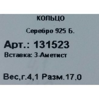 Камень: аметист. В изделии применяются натуральные камни с цельной структурой и/или с соответствующим химическим составом. Металл: серебро. Вес: 4,10 гр. Тип кольца: имеет фиксированный размер, перед покупкой выберите нужный размер в выпадающем списке. Размер украшения: 2 x 1,7 см. Месторождение камня: Бразилия. None Возможен самовывоз. Есть доставка.