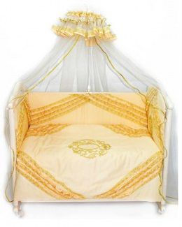 Комплект в кроватку Виконт 7 предметов 60x120 Bombus с отделкой из золотистого кружева и вышивкой в виде вензеля. Наличные, Visa/MasterCard, Яндекс.Деньги, WebMoney Возможен самовывоз. Есть доставка.