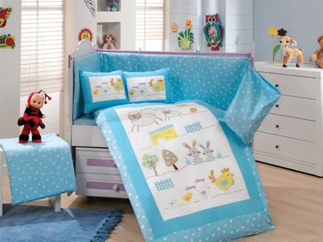 Цвет: голубой, Тип ткани: поплин Плотность: 120 гр/м2 Состав - 100% Хлопок В комплект входит: одеяльце 100х150 см, 2 подушечки 35х45 см, бортик в кроватку 45х210, матрасик 45х65 см пододеяльник 100х150 см, простыня 100х150 см, 2 наволочки 35х45 см, 1 наволочка 40х60 см. и мешочек. Комплект упакован в ПВХ сумку. Текстиль высшего качества None Возможен самовывоз. Есть доставка.