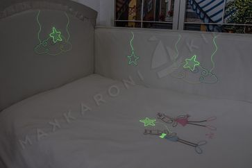 Комплект в кроватку 60х120 см 6 предметов Horses молочный Makkaroni Kids - набор, включающий простыню на резинке, пододеяльник с застежкой-молнией, наволочку, подушку, одеяло и бортик, состоящий из четырех частей и снабженный съемным чехлом. Наполнителем для бортика выступил Холлкон - гипоаллергенный материал, поддерживающий свободную циркуляцию воздуха. Для одеяла и подушки использована смесь из Холлкона и бамбукового волокна. Белье пошито из гладкого гипоаллергенного сатина и украшено оригинальной вышивкой с неоновыми нитями, которые светятся в темноте непродолжительное время. Для детей от рождения до 3 лет. Наличные, Visa/MasterCard, Яндекс.Деньги, WebMoney Возможен самовывоз. Есть доставка.