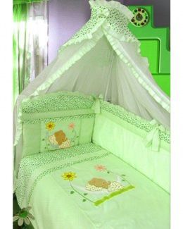 Комплект в кроватку 7 предметов Сладкий сон зеленый Золотой гусь - набор постельных принадлежностей с милой аппликацией и оборками. Изготовлен из натуральной хлопковой ткани и окрашен нейтральными красителями. Наполнителем для одеяла, подушки и бортика выступил Холлофан - упругий гипоаллергенный материал, имеющий незначительный вес, быстро восстанавливающий первоначальную форму и обладающий хорошими теплоизоляционными свойствами. Для детей от рождения до 3 лет. Наличные, Visa/MasterCard, Яндекс.Деньги, WebMoney Возможен самовывоз. Есть доставка.