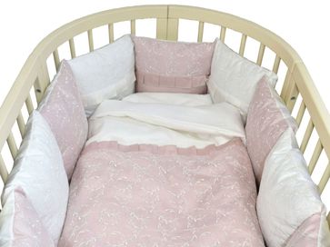 Состав комплекта (ШхГ): <br> Защитный бампер: 300 х 3600 мм.<br> Подушка: 400 х 600 мм.<br> Одеяло: 1060 х 1420 мм.<br> Простыня на резинке: 980 х 1450 мм.<br> Наволочка: 400 х 600 мм.<br> Пододеяльник: 1080 х 1450 мм.<br>