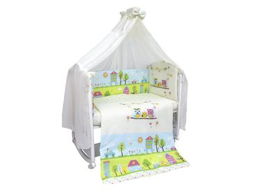 Состав комплекта (ШхГ): <br> Защитный бампер: 360 х 4000 мм.<br> Подушка: 400 х 600 мм.<br> Одеяло: 960 х 1420 мм.<br> Простыня на резинке: 980 х 1450 мм.<br> Наволочка: 400 х 600 мм.<br> Пододеяльник: 980 х 1450 мм.<br> Балдахин: 1700 х 4000 мм.<br>