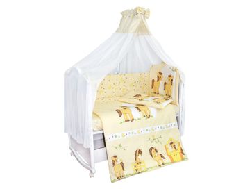 Состав комплекта (ШхГ): <br> Защитный бампер: 400 х 3600 мм.<br> Подушка: 400 х 600 мм.<br> Одеяло: 960 х 1420 мм.<br> Простыня на резинке: 980 х 1450 мм.<br> Наволочка: 400 х 600 мм.<br> Пододеяльник: 980 х 1450 мм.<br> Балдахин: 1750 х 4000 мм.<br>