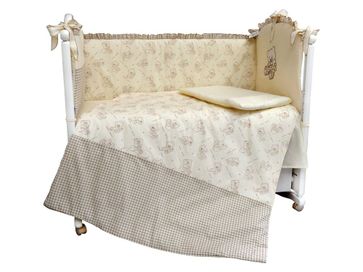 Состав комплекта (ШхГ): <br> Защитный бампер: 360 х 4000 мм.<br> Простыня на резинке: 980 х 1450 мм.<br> Наволочка: 400 х 600 мм.<br> Пододеяльник: 1080 х 1450 мм.<br>