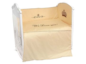 Состав комплекта (ШхГ): <br> Защитный бампер: 400 х 3600 мм.<br> Подушка: 400 х 600 мм.<br> Одеяло: 1060 х 1420 мм.<br> Простыня на резинке: 980 х 1450 мм.<br> Наволочка: 400 х 600 мм.<br> Пододеяльник: 1080 х 1450 мм.<br>
