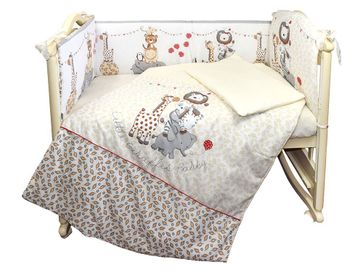 Комплект в кроватку Вечеринка жирафика — уютное украшение спального места малыша. Забавные изображения животных станут прекрасным развлечением для юного первооткрывателя, а натуральная ткань поможет поддерживать здоровый микроклимат во время сна. Мягкий бампер и простыня на резинке делают набор особенно удобным.<br>