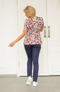 Описание Блуза женская, полуприлегающего силуэта, без застежки, с фигурной горловиной, разрезами в боковых швах Перед с нагрудными вытачками, отрезными кокетками, нижними накладными карманами, входящими в боковые швы По правому карману проложена дополнительная строчка на расстоянии от края и пришит ф/металлический ярлык Спинка с плечевыми и талиевыми вытачками Горловина обработана деталями из отделочной ткани Обтачка ростка настрочена по спинке насквозь Рукава одношовные, втачные, короткие В шве левой кокетки шлевка из отделочной ткани В тон шлевки поставлены закрепки на концах карманов None Есть доставка.