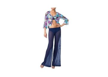 Великолепная пляжная двойка! Стильный брючный костюм из мягкой эластичной сетки. Эффектная блуза с изящными длинными рукавами, с драпированными передними деталями на крупном золотом кольце. Блуза выполнена в изысканном принте "Хризантемы в облаках". Эффектные брюки вальяжного кроя из однотонной сетки глубокого синего цвета локонично завершают пляжный ансамбль. None Страна производства: Италия Есть доставка.