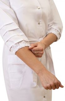 Халат женский, полуприлегающего силуэта, с застежкой на кнопки, разрезами в боковых швах и съемным поясом. Перед с нагрудными вытачками, боковыми карманами. Правый боковой карман состоит из двух частей, на одной из которых настрочены декоративные складки. На левой полочке притачная шлевка для бейджа. Спинка с отрезной кокеткой и средним швом. Горловина обработана отложным воротником с отрезной стойкой. Рукава втачные, одношовные, с декоративными складками в нижней части. Низ рукавов собран эластичной тесьмой. Имеют две длинны: ¾ и А. None Есть доставка.