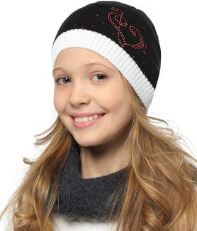 Черная шапка для девочки торговой марки "Larmini" декорирована оригинальным рисунком из страз. Представленная модель одинарной вязки, без подкладки, на прохладную весеннюю погоду. Минимальная сумма заказа 1500 руб. Возможен самовывоз. Есть доставка.