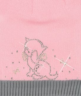 Розовая шапка для девочки "Кошечка" торговой марки "Larmini" декорирована оригинальным рисунком из страз. Представленная модель одинарной вязки, без подкладки, на прохладную весеннюю погоду. Минимальная сумма заказа 1500 руб. Возможен самовывоз. Есть доставка.