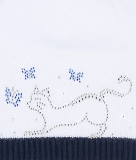 Белая шапка "Кошечки" торговой марки "Larmini" декорирована оригинальным рисунком из страз. Представленная модель одинарной вязки, без подкладки, на прохладную весеннюю погоду. Минимальная сумма заказа 1500 руб. Возможен самовывоз. Есть доставка.