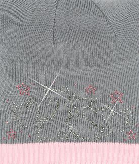 Серая шапка "Кошечки" торговой марки "Larmini" декорирована оригинальным рисунком из страз. Представленная модель одинарной вязки, без подкладки, на прохладную весеннюю погоду. Минимальная сумма заказа 1500 руб. Возможен самовывоз. Есть доставка.