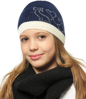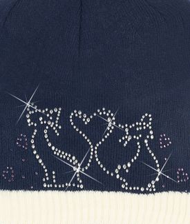 Темно-синяя шапка "Кошечки" торговой марки "Larmini" декорирована оригинальным рисунком из страз. Представленная модель одинарной вязки, без подкладки, на прохладную весеннюю погоду. Минимальная сумма заказа 1500 руб. Возможен самовывоз. Есть доставка.