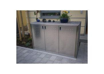 На выбор заказчика предоставляется более 12 видов материала консолей, 16 цветов окраски дверей. Комплектации шкафов - для 1,2 и 3-х контейнеров емкостью от 80 до 240 литров. Герметичность, опрятность, эстетика.