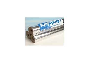 Алукрафт — пароизоляция отражающая тепло Алукрафт представляет собой многослойный материал: между крафт-бумагой и полированной алюминиевой фольгой помещен слой полиэтиленовой пленки. Рекомендуется использовать в качестве идеальной пароизоляции при строительстве: бань, саун, бассейнов, ванных комнат, кухонь и других помещений с повышенной влажностью. В мировой практике, фольга без основы (крафт-бумага, сетка и т.д.) никогда не используется для пароизоляции. Не смотря на то, что фольга является идеальным пароизоляционным материалом, в то же время этот материал чрезвычайно непрочен на разрыв и прокол. Поэтому все фольгированные материалы для пароизоляции саун, бань, бассейнов, для предотвращения катастрофических последствий попадания пара в строительные конструкции, должны быть на армированной основе, что подтверждает строительная практика.