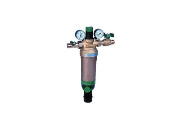 Функциональные особенности Высокая прочность Надежность и эффективность прибора объясняются высококачественными материалами, применяемыми в его изготовлении. Сам корпус выполнен из латуни, также как резьбовые штуцеры и запорный шаровой клапан. Фильтрующий сетчатый элемент изготовлен из нержавеющей стали. Синтетический материал послужил сырьем для производства пружинного стакана, держателя сетки фильтра, гильзы обратного клапана и вкладыша клапана. Непрозрачная чаша фильтра из красной бронзы специально предназначена для горячей воды. Конструкция Фильтр серии HS 10S представляет собой комбинированный водоразборный узел и объединяет в себе корпус, чашу фильтра, манометры (впускной и выпускной), пружинный стакан, сетчатый фильтрующий элемент, впускной обратный клапан, вкладыш клапана, запорный шаровой клапан и шаровой клапан с дренажным штуцером, а также накидной ключ (для клапана и чаши). Встроенный клапан понижения давления (редукционный) защищает от колебаний давления и уменьшает расход воды. Обратный клапан предохраняет магистральный водопровод от опасных для здоровья жидкостей. Фильтр тонкой очистки предотвращает от попадания посторонних частиц. Прибор прост в эксплуатации и обслуживании и чрезвычайно компактен. Фильтр тонкой очистки прошел необходимые проверки и соответствует европейским стандартам. Принцип действия В режиме фильтрации водный поток проходит через основную нижнюю секцию сетчатого вкладыша фильтра в нап