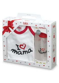 Подарочный набор Bibi в красивой упаковке содержит хлопковое боди с коротким рукавом и принтом I love Mama и полипропиленовую бутылочку с силиконовой противоколиковой соской. Минимальная сумма заказа 1500 руб. Возможен самовывоз. Есть доставка.