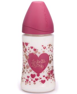 Бутылочка "Сердце" цвета фуксия торговой марки "Suavinex" 270 мл с анатомической силиконовой соской и широким горлышком подойдет для кормления малышей от 0 мес. Анатомическая соска способствует уменьшению давления на небо, имитируя форму материнской груди. Бороться с коликами помогает специально предусмотренный клапан, компенсирующий отрицательное напряжение воздуха внутри бутылки, поэтому не дает ребенку глотать воздух во время кормления, что способствует здоровому пищеварению. Кроме того, у бутылочки широкое горлышко, облегчающее приготовление еды и дальнейшую очистку тары. Изготовлена из полипропилена - прочного и нетоксичного материала, не содержит бисфенол. Минимальная сумма заказа 1500 руб. Возможен самовывоз. Есть доставка.