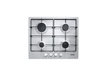 Газовая варочная панель шириной 60 см, 4 высокоэффективные конфорки, автоматический электроподжиг, газ-контроль каждой конфорки, передние металлические регуляторы, эмалированные решетки, в комплекте - адаптер для кофейника, цвет - нержавеющая сталь. None