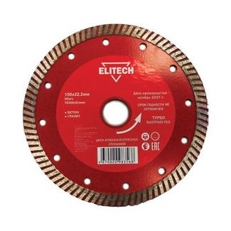 Алмазный диск турбо со сплошной кромкой ELITECH 1820.058600 используется для резки бетона, гранита. Применение диска со сплошной кромкой минимизирует риск появления сколов на линии реза и позволяет добиться максимально возможного качества распила. Сплошная кромка легко перегревается и поэтому должна при работе охлаждаться водой.
