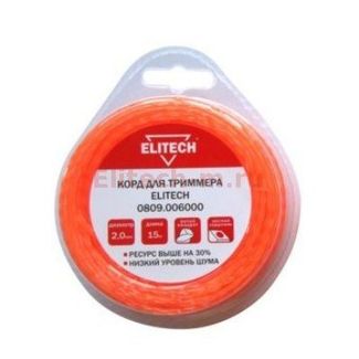 ELITECH 0809.006000 - леска для триммеров, сечение «Витой квадрат», жесткий сердечник, 2.0 мм х 15 м. Обладает ресуром, на 30 % выше обычного, и низким уровнем шума.