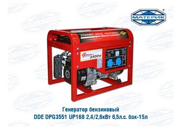 - Генератор бензиновый DDE DPG3551 UP168 2,4 2,6кВт 6,5л.с бак-15л по выгодной цене 8 639 р. руб.;