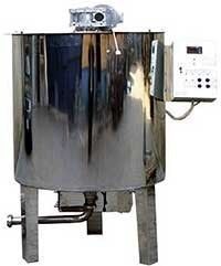 1 куб., трехслойная. Сироповарки используются для приготовления сахарного сиропа, инверта, роспуска возвратных отходов и др. и других продуктов, требуемой концентрации. Сироповарочный котел применяются в кондитерской, молочной, плодоовощной и других отраслях промышленности. Устройство сироповарочного котла Сироповарка представляет собой трехслойную емкость с рубашкой, теплоноситель – глицерин или пар под давлением, утепление минеральной ватой, на опорах, дно — конус (торосфера), крышка 1/3. Перемешивающее устройство рамного типа с фторопластовыми скребками и мотор-редуктором. Для нагрева теплоносителя в нижней части емкости установлена ТЭНная коробка. Во избежание образования застойной зоны в нижней части котла находится «грибковая пробка». Загрузка готового продукта происходит через откидывающуюся крышку. Вода подается через штуцер, расположенный на крышке емкости. Сироповарка укомплектована пультом управления, включающий пускатели ТЭНов, перемешивающего устройства, измерители-регуляторы температуры. Сироповарка может быть любого объема. Вместо ТЭНной коробки для обогрева продукта может быть встроен змеевик или предусмотрена рубашка под пар. Процесс приготовления сиропа может быть полностью автоматизирован. Предлагаем варочные котлы различных конфигураций и назначения: объемом от 50 до 6000 литров; различной формы (круглые/прямоугольные); паровые обогрев паром может осуществляться как по змеевику так и подачей пара в паровую рубашку электрические нагрев теплоносителя с помощью ТЭНов; Мощность ТЭНов и тип теплоносителя определяется в соответсвии с особеностями технологического процееса с термоизоляцией; оснащенные перемешивающими устройствами: рамными; якорными; пропеллерными; лопастными укомплектованные пультом управления КИП и А Включающий, пускатель ТЭНов и перемешивающие устройства, датчики измерения и регулировки температуры нагрева. возможна установка загрузочно-выгрузочных и смотровых люков различных типов и размеров, а также патрубков и другого дополнительно